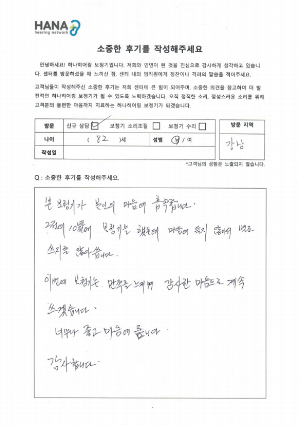 본 보청기가 본인의 마음에 흡족합니다. 10년 전에 보청기를 했는데 마음에 들지 않아서 별로 쓰지를 않았습니다. 이번에 보청기는 만족도를 느끼며 감사한 마으므오 계속 쓰겠습니다. 너무나 좋고 마음에 듭니다. 감사합니다.