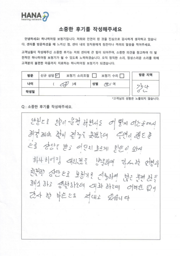 난청으로 많이 불편하면서도 어떻게 어느 곳에서 해결해야 할지 결정을 못했는데, 오연히 핸드폰으로 상담을 받고 어딘지 모르게 믿음이 와서 하나히어링 대리점을 방문하여 자세한 설명과 친절한 상담으로 보청기를 신청하여 많은 불편함을 해소하고 생활하는데 대화하는데 어려움 없이 감사한 마음으로 지내고 있습니다.