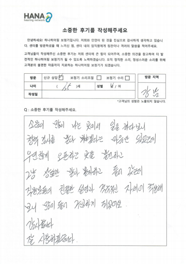 소음이 많이 나는 곳에서 일을 하다보니 청력검사를 받아 봐야겠다는 마음만 있었는데 우연찮게 오픈하는 곳을 발견하고 그냥 상담만 받아 볼까하고 들어갔는데 직원분들의 친절한 설명과 적극적인 자세에 착용 해 보니 맘에 들어 구입하게 되었어요, 감사합니다. 잘 사용하겠습니다.