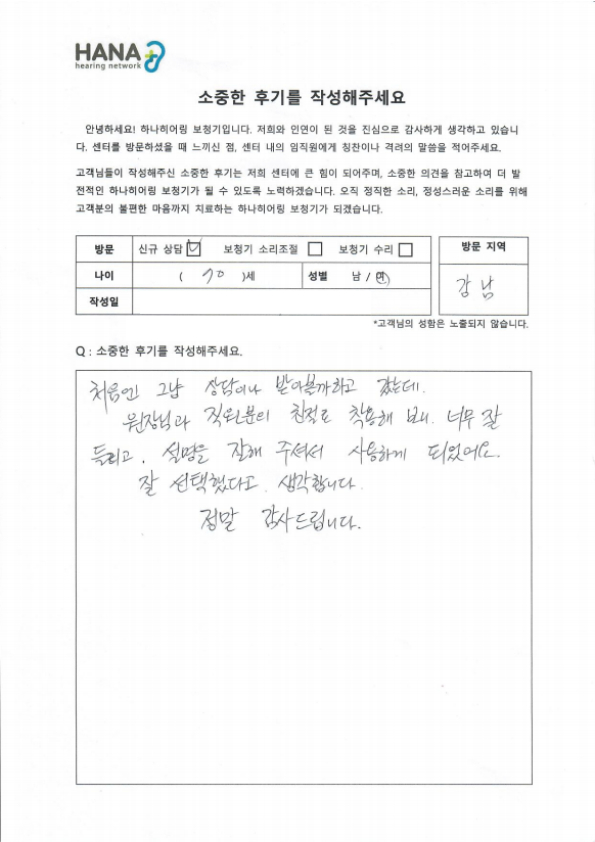 처음엔 그냥 상담이나 받아볼까 하고 갔는데, 원장님과 직원분의 친절로 착용 해 보니, 너무 잘 들리고, 설명을 잘 해주셔서 사용하게 되었어요. 잘 선택했다고 생각합니다. 정말 감사드립니다.