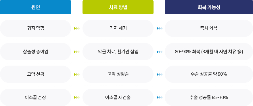 하지만 달팽이관과 청신경은 정상이기 때문에, 원인만 해결하면 청력이 회복됩니다.특징 내용 왜 생기나요? 귀지 막힘, 중이염, 고막 천공, 이소골 손상, 이경화증 등 어떤 증상이 나타나나요? 소리가 작게 들림, 귀가 먹먹함, 본인 목소리가 울림 회복 가능한가요? 대부분 가능 (원인 제거 후 청력 회복)치료 방법은? 귀지 제거, 약물 치료, 수술 (고막·이소골 재건)