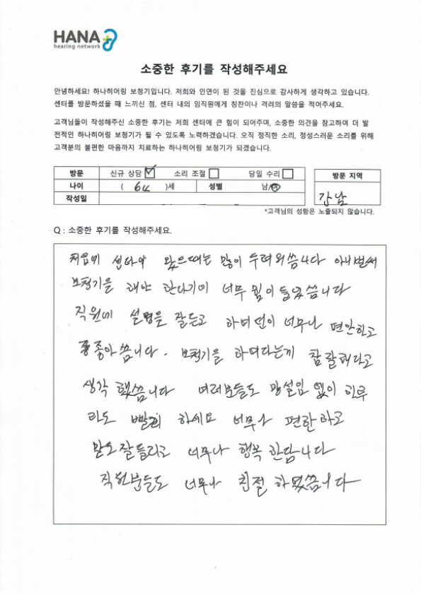 처음에 센터에 왔을 때는 많이 두려웠습니다. 벌써 보청기를 해야 한다기에 너무 힘이 들었습니다. 직원의 설명을 잘 듣고 하였더니 너무나 편안하고 좋았습니다. 보청기를 하였다는게 참 잘 했다고 생각 했습니다. 여러분들도 망설임 없이 하루라도 빨리 하세요. 너무나 편안하고 말도 잘 들리고 너무나 행복하답니다. 직원분들도 너무나 친절하였습니다.