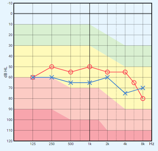 전 주파수 대역에서 모두 중도~중고도 난청 수준으로 청력이 떨어짐을 확인할 수 있었습니다.