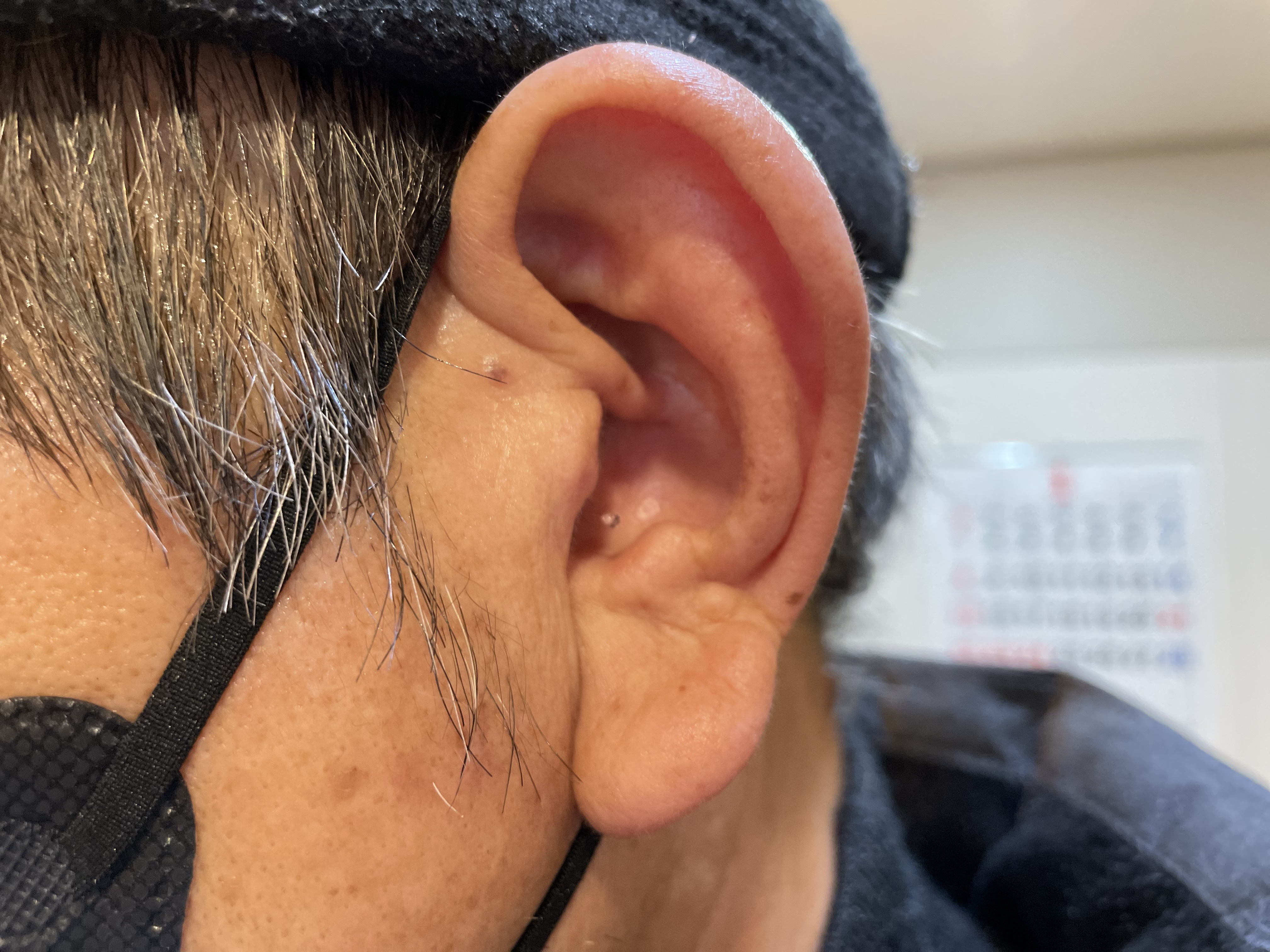 아주 가까이서 귓속을 들여봐야만 보청기의 플레이트가 살짝 보이는데요