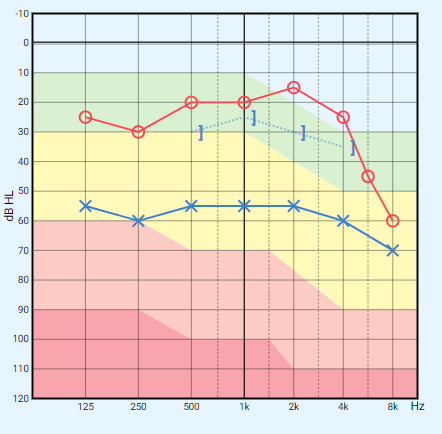 왼쪽 귀는 중고도 난청 수준의 청력을 보입니다.